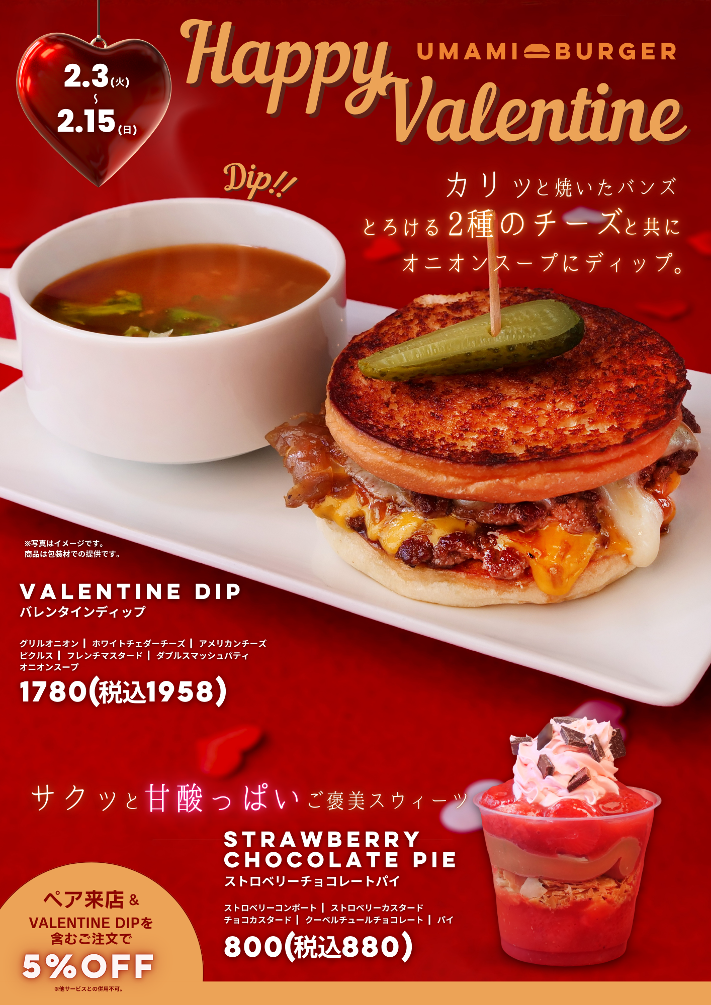 又、ペア来店&VALENTINE DIPを含むご注文でお会計𝟱%𝗢𝗙𝗙 !